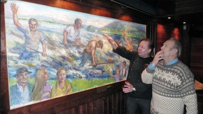 Henkilöhahmoja Kallaveden järvi- ja metsämaisemassa 1989, n. 10 m, triptyykki, Siilinjärven koulutuskeskuksen aula, Siilinjärvi